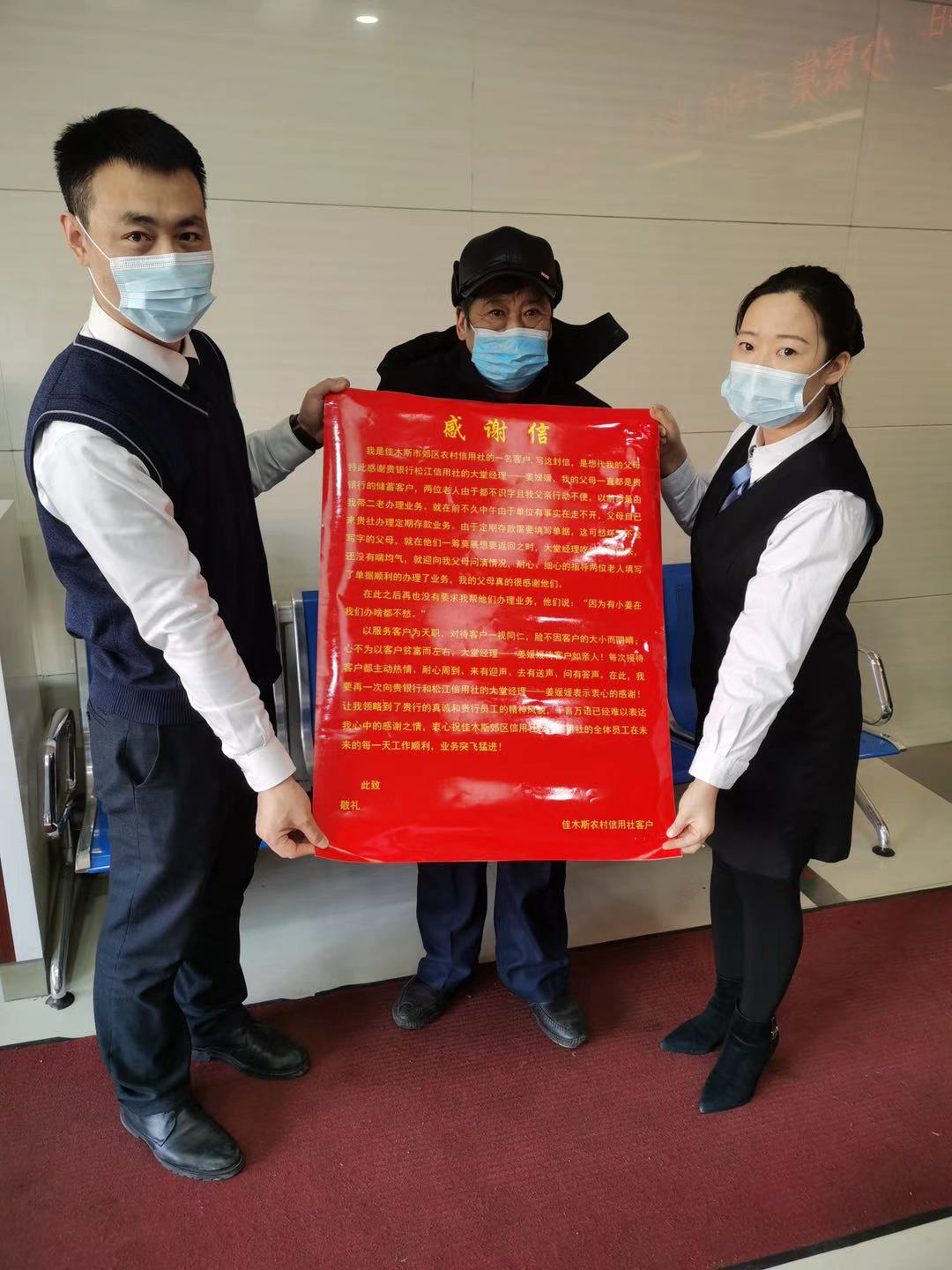 近日,佳木斯市郊区农村信用合作联社松江信用社收到一封客户感谢信。客户郭先生专程带着父母来到信用社,将这封感谢信送到了大堂经理姜媛媛手中。