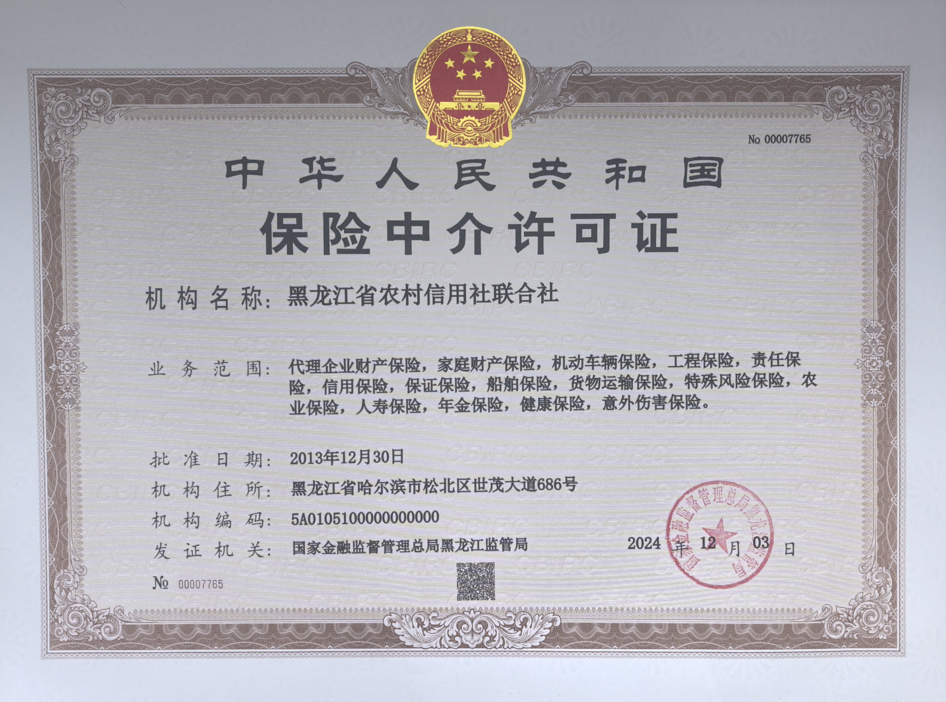 黑龙江省农村信用社联合社更换新版保险兼业代理业务许可证